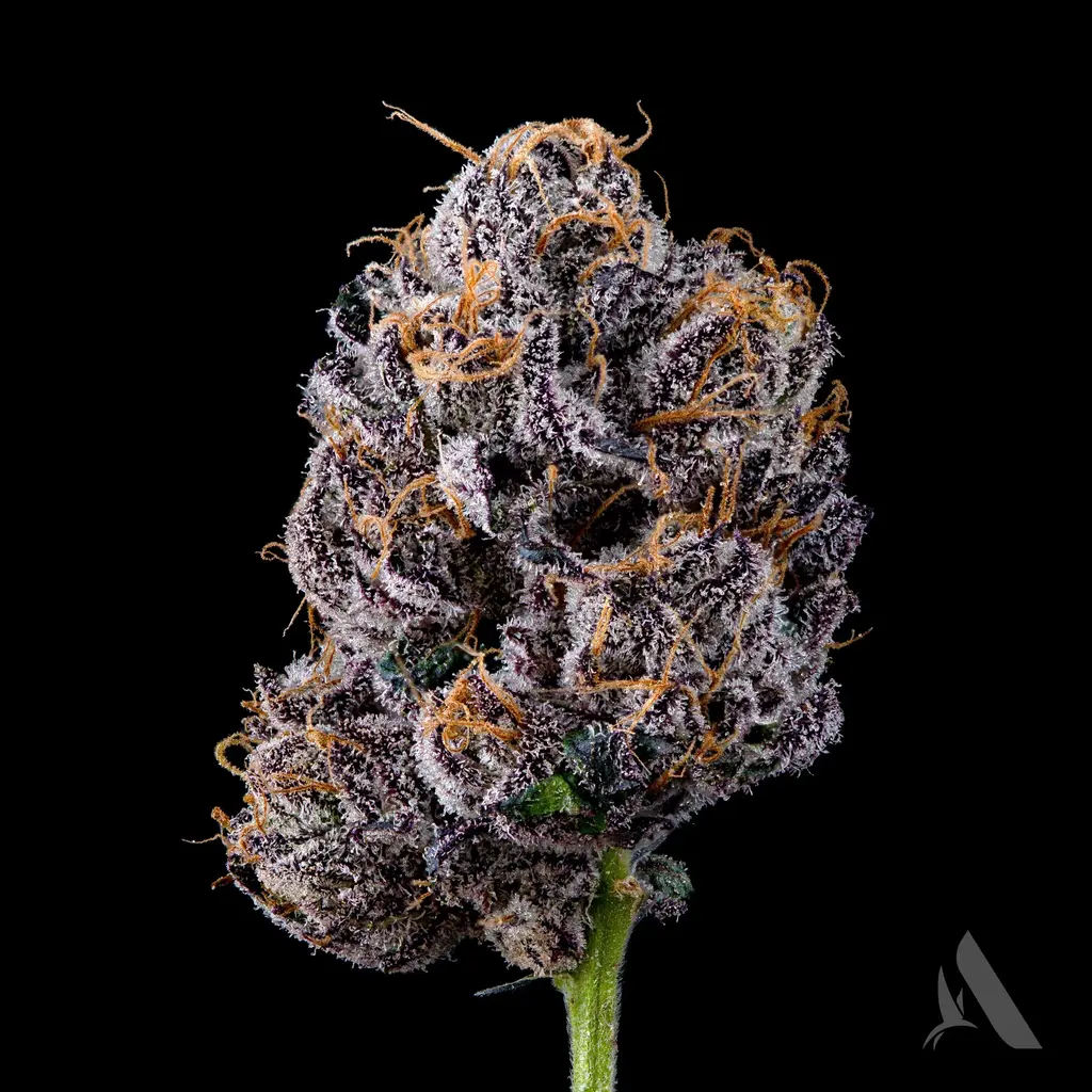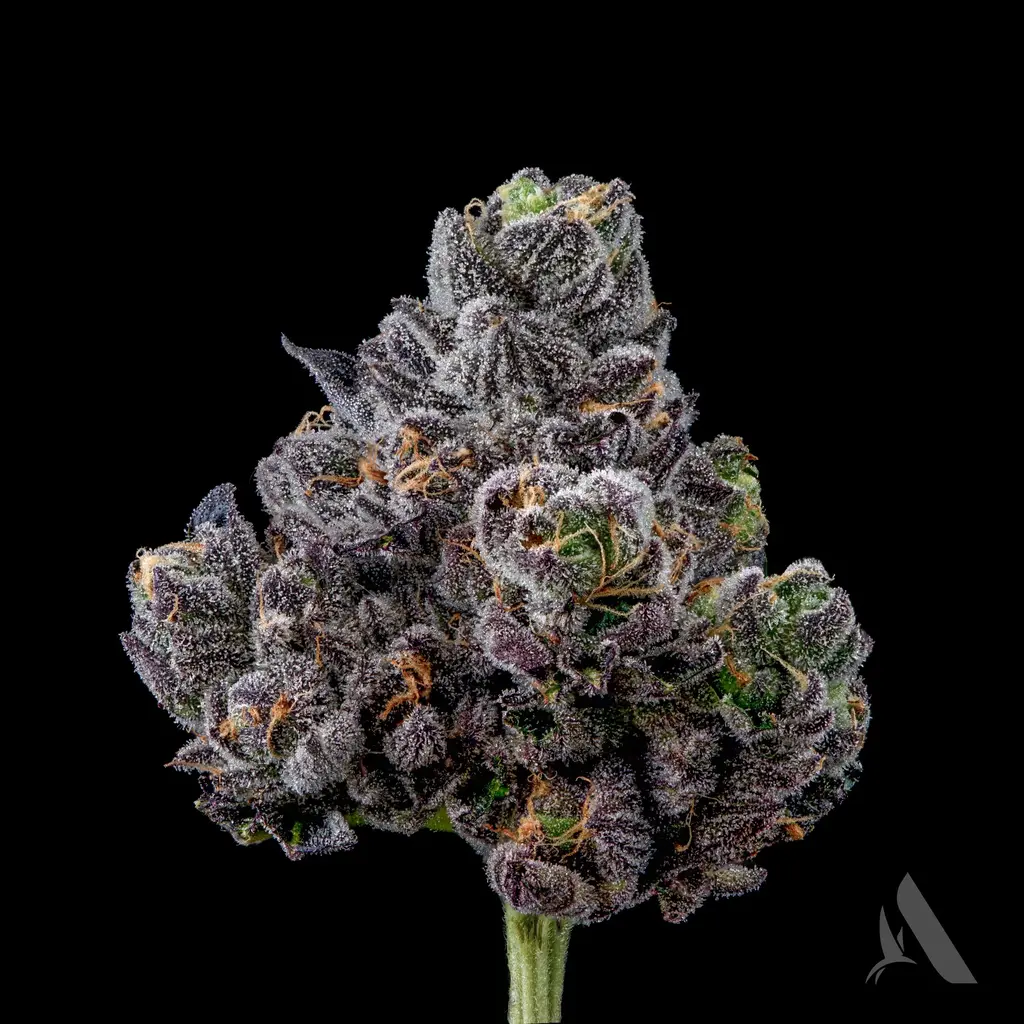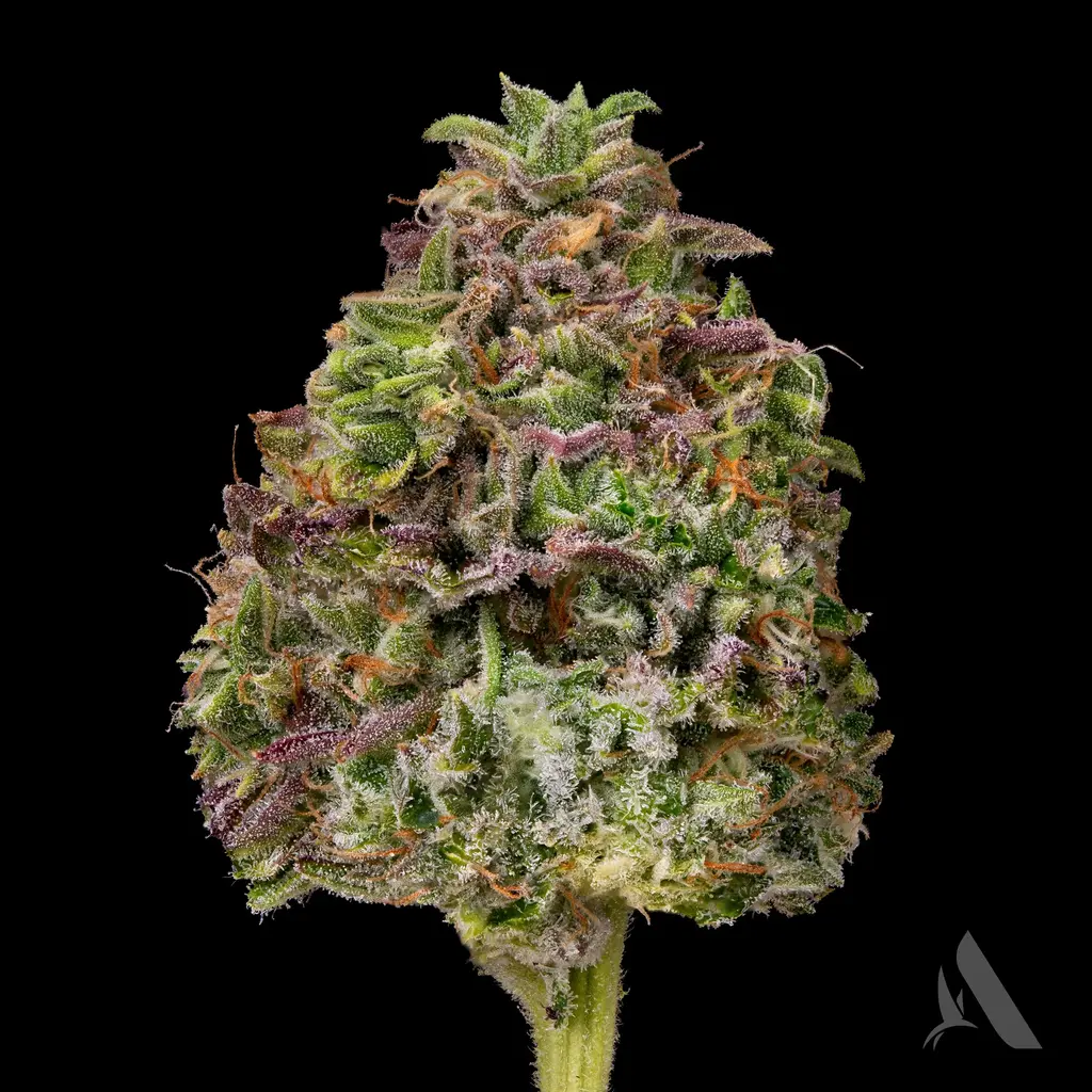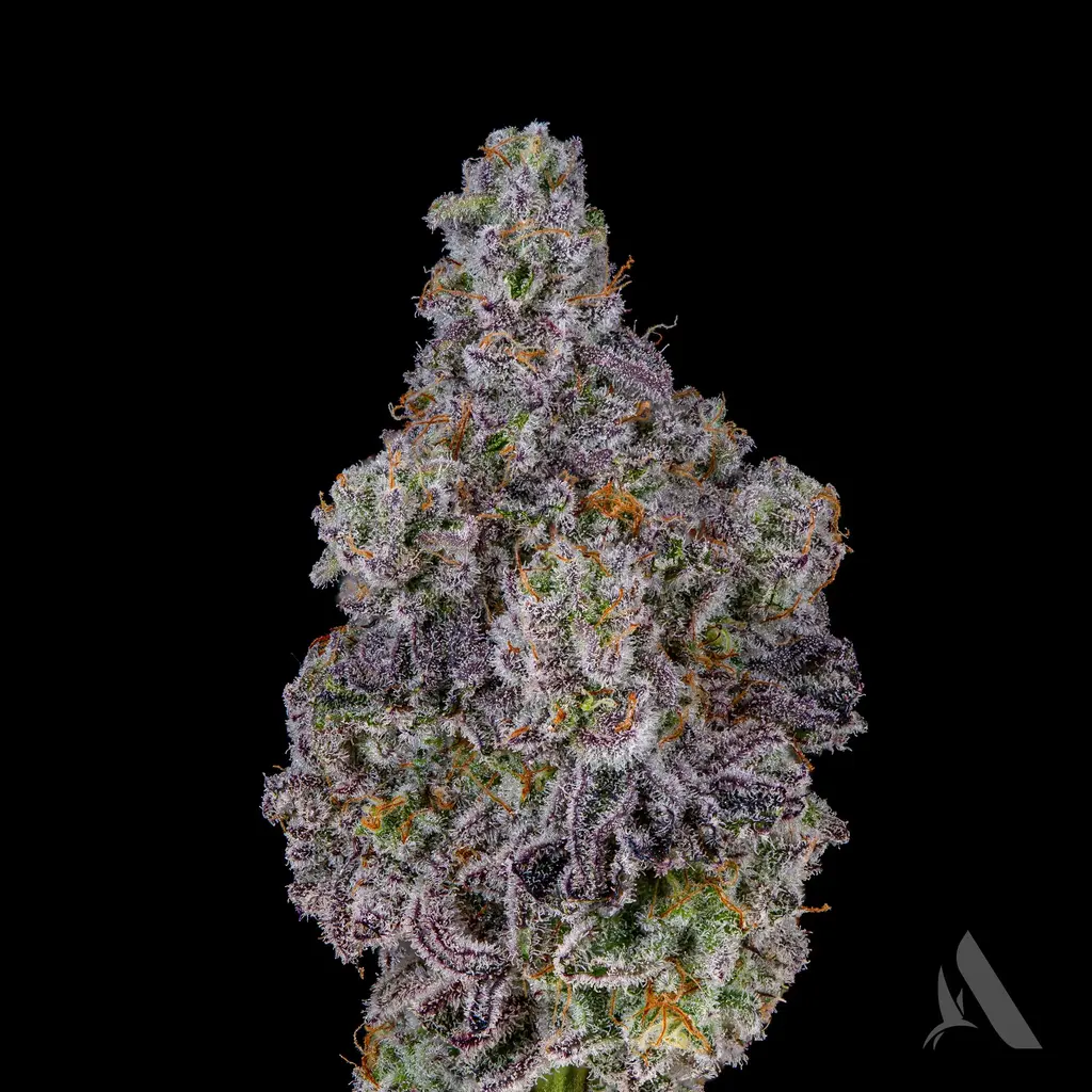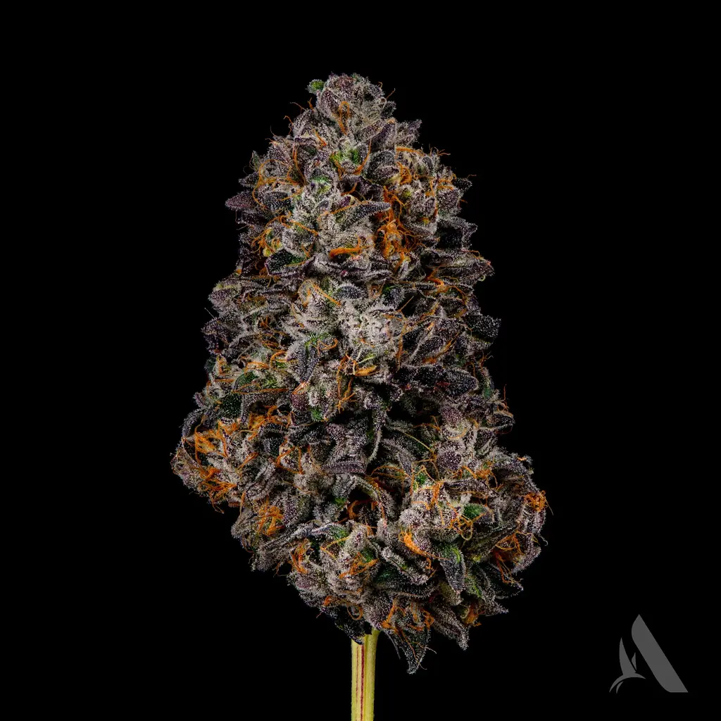 Indulge in the essence of Apples & Bananas. This hybrid strain is a complex cross of Platinum Cookies, Grandaddy Purp, Blue Power, & Gelatti. Its aroma provides strong hints of fruit. Its buds, richly covered in trichomes, are a testament to its premium cultivation.